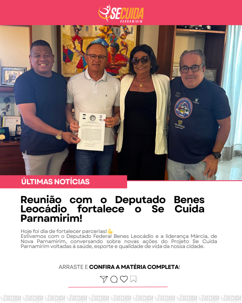 Nesta semana, representantes do Projeto Se Cuida Parnamirim estiveram reunidos com o Deputado Federal Benes Leocádio, grande apoiador da iniciativa idealizada pelo Professor Ângelo e sua equipe, com assessoria do Sr. Carlos Alexandre, conselheiro da Federação de Esporte.